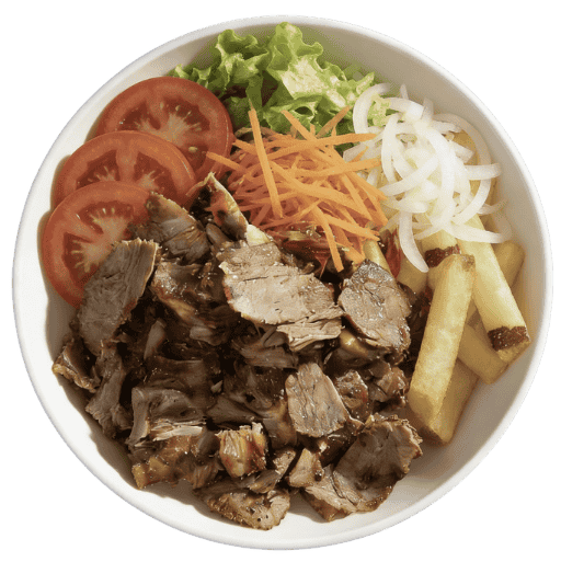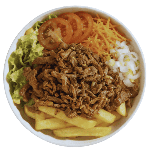Shoarma, frietjes, smelt kaas, ui, paprika, champignons, saus