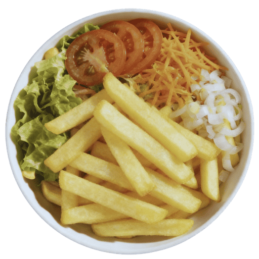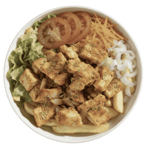 Kip, frietjes, smelt kaas, ui, paprika, champignons, saus